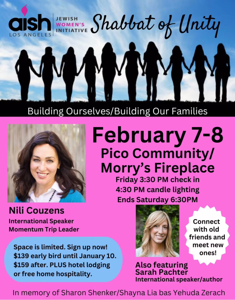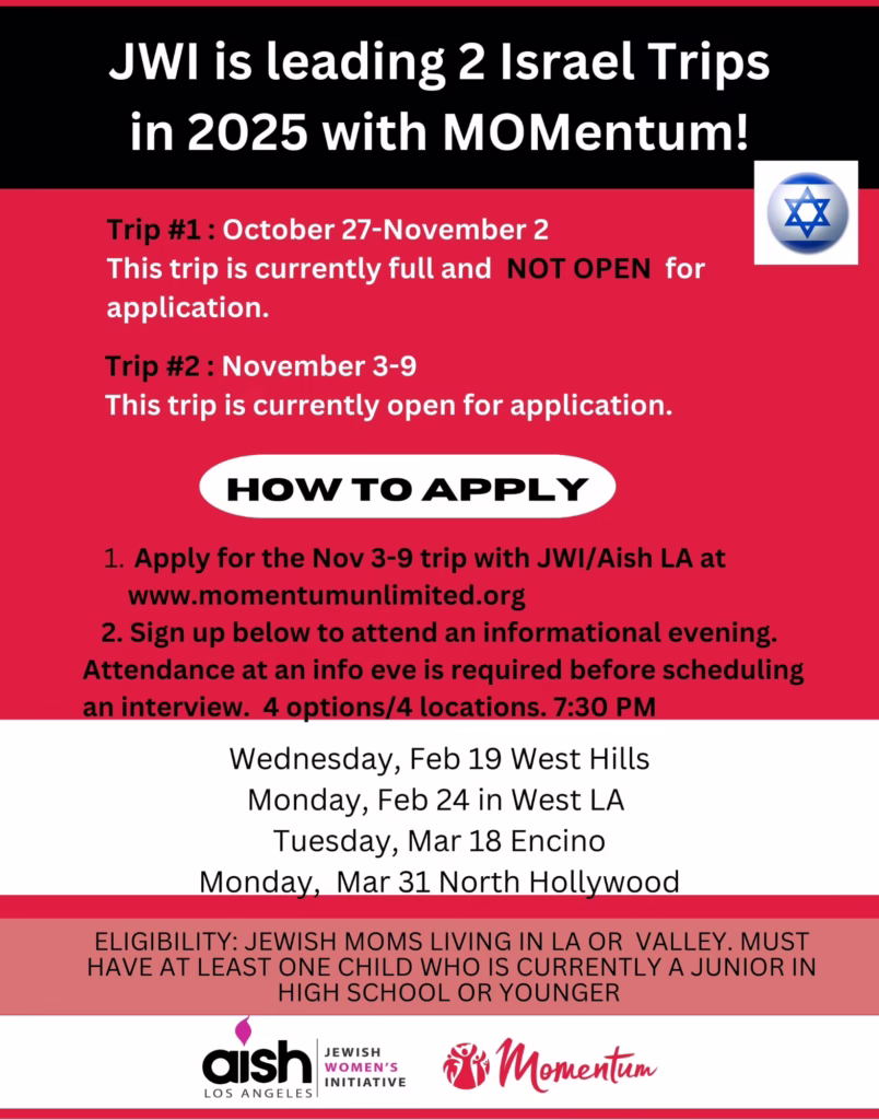 JWI provides a space for Jewish women to connect, share perspectives, and receive guidance, while having an incredible time. Frequent topics of discussion include personal development, relationships and a deeper understanding of Jewish values, observance, and spiritual connection. The women of JWI enjoy insightful classes, Shabbat dinners, social events, a yearly trip to Israel and an annual women’s Shabbat of Unity. The Israel trip, in partnership with Momentum (www.momentumunlimited.org) combines fun and adventure with sisterhood and spiritual exploration. JWI inspires Jewish women across Los Angeles to create meaningful connections to G-d, Jewish wisdom, and one another. JWI believes in and supports the power of the Jewish Mom to shape her home, community, and in turn, the world.